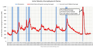 The dashed line on the graph is the current 4-week average. The four-week average of weekly unemployment claims decreased to 224,250.