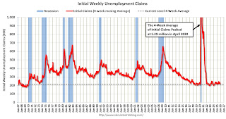 The dashed line on the graph is the current 4-week average. The four-week average of weekly unemployment claims decreased to 214,750.