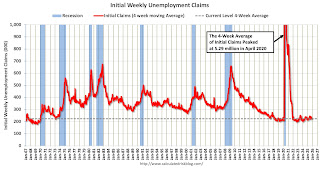 The dashed line on the graph is the current 4-week average. The four-week average of weekly unemployment claims decreased to 223,750.