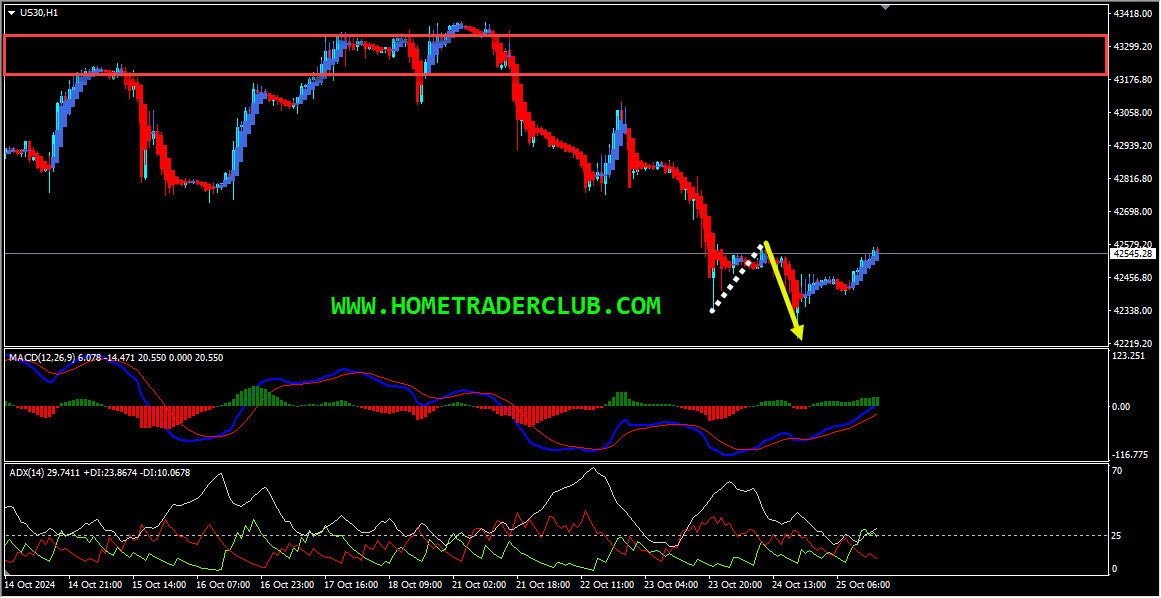 Dow Jones – My idea here was “On the H1 chart, currently, we have a strong bearish momentum and the price which is moving lower has broken below a strong support zone and is holding below it, we may consider this as evidence of bearish pressure. After the breakout, this strong support zone is acting as a strong resistance zone for us. Also, the price which is moving lower has created a bearish trend pattern in the form of three lower highs, lower lows which we may consider as evidence of bearish pressure. Generally, after a bearish trend pattern, we may expect corrections and then further continuation lower. Currently it looks like a correction is happening. Also, based on the Heikin Ashi candles we can see that currently, we have strong bearish bodies in downward moving market conditions so it basically reflects a bearish environment. In addition to this, the ADX indicator gave a bearish signal here at the cross of -DI (red line) versus +DI (green line) and the main signal line (silver line) reads value over 25 which we may consider as yet another evidence of bearish pressure. So the bottom line here is that, everything looks good here for the bears and I expect the price to move lower further in the short term after pullbacks until the strong resistance zone (marked in red) shown in the image below holds”.