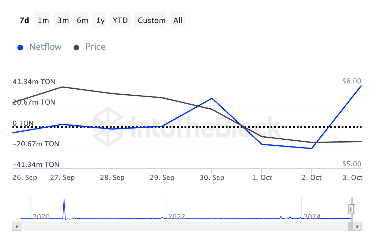 However, this has not deterred the whales from buying the altcoin, demonstrating their long-term confidence in its price growth. In the past seven days, TON’s large holders’ netflow — the difference between the coins whale addresses buy and sell over a specific period — has skyrocketed by 1698%.
