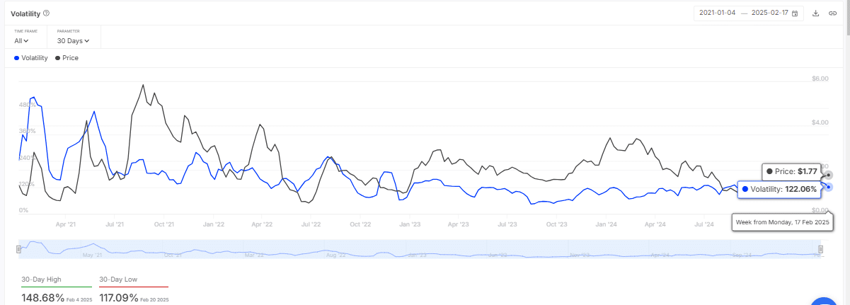 The 30-day high hit 148.68% on 04 February, while the 30-day low dipped to 117.09% on 20 February, indicating a downward trend in volatility.