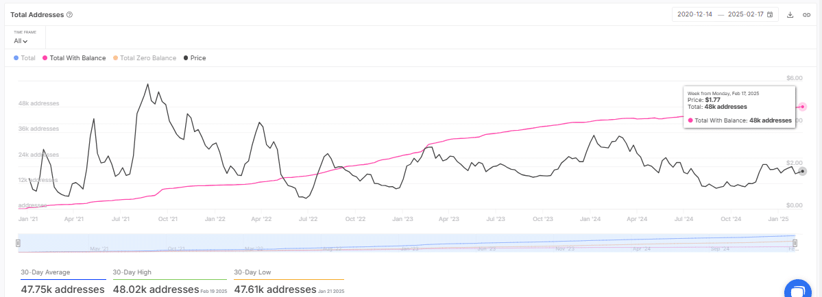 The number of active addresses with a balance has shown a steady uptrend too, climbing to 48,000 by 17 February 2025. Despite fluctuations in price, total addresses with a balance have continued to grow over time – A sign of sustained user participation and holding activity across the network.