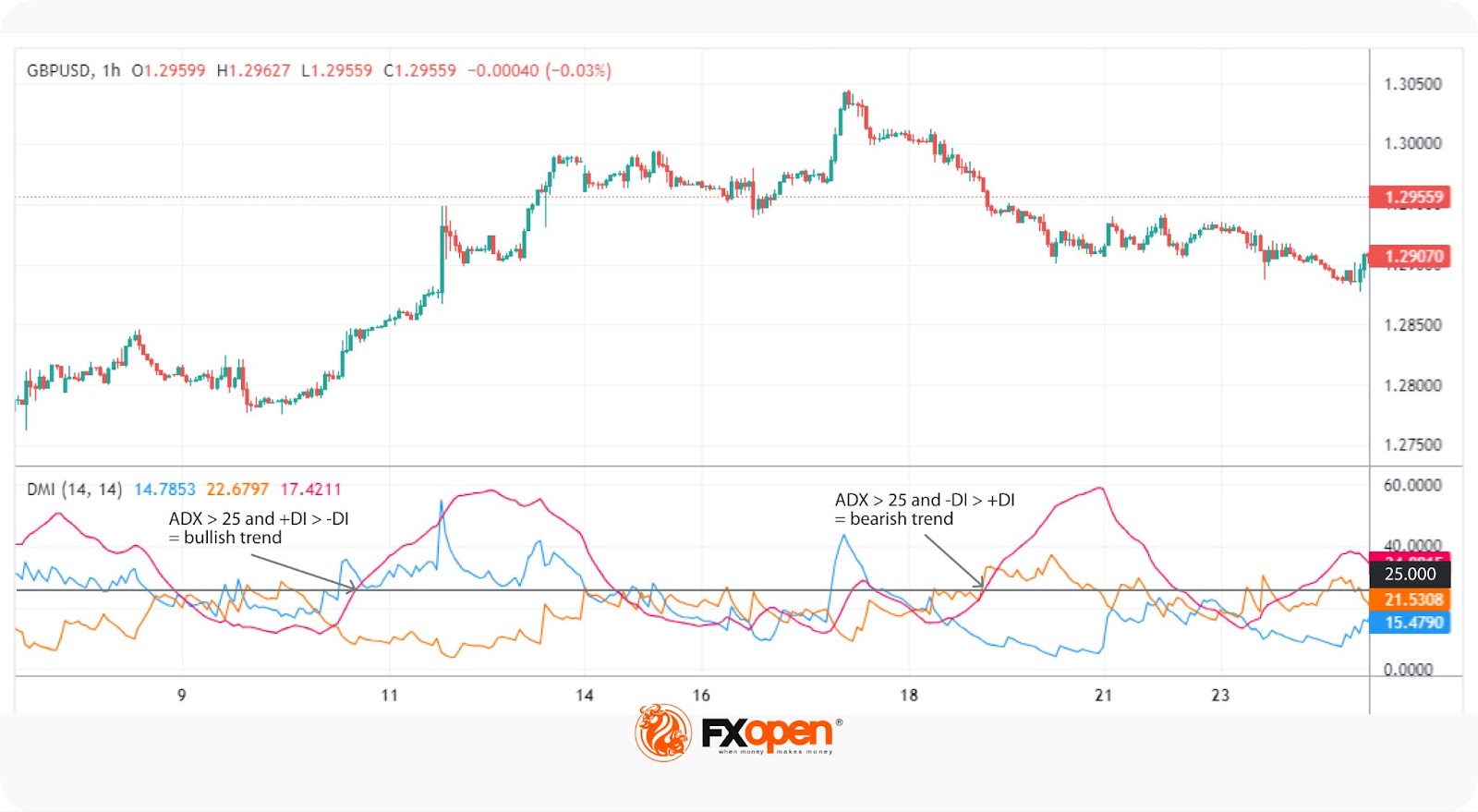 Key signals include the 25 level: a reading above this suggests that a trend is gaining strength. As ADX rises, the trend intensifies, and when it falls, the trend may be weakening, though this doesn’t necessarily imply a reversal.