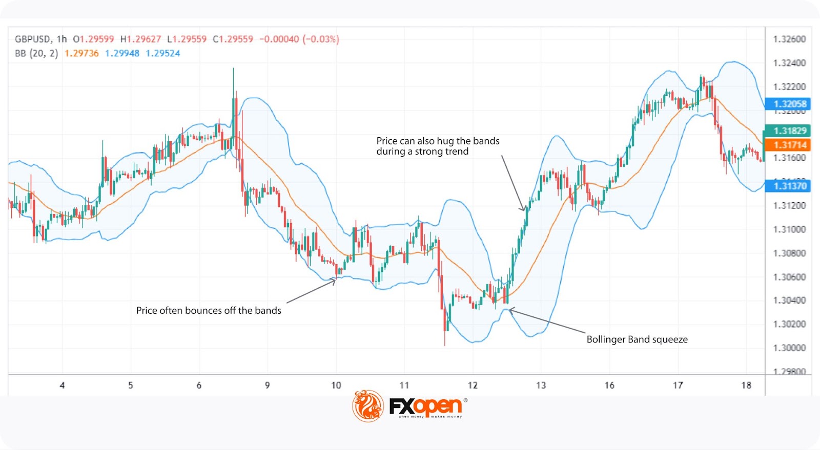 Another important signal Bollinger Bands provide is the Bollinger Band squeeze. This occurs when the bands contract tightly around the price, indicating low volatility. Traders see this as a precursor to a potential breakout, though the direction of the move is unknown until confirmed by price action. Once volatility expands, traders can look for a breakout above or below the bands to gauge direction.