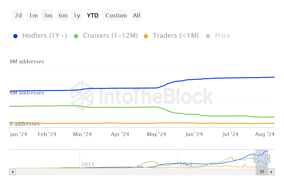 Meanwhile, the number of cruisers or swing traders dropped from 2.68 million at the start of 2024 to 1.25 million addresses more recently.