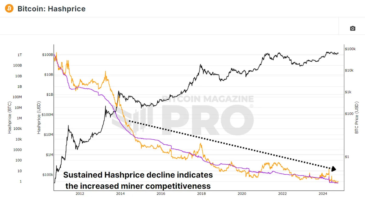 While we’ve discussed miner earnings in relation to Bitcoin’s price, another important factor is the Hashprice, the amount of BTC or USD miners can earn for each terahash (TH/s) of computational power they contribute to the network.