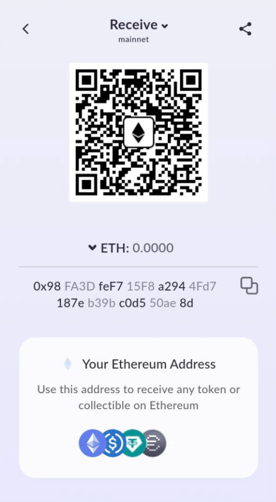 Open your crypto wallet app or browser extension and select Ethereum (ETH) from the list of coins. Look for the option that says “Receive”. Once you tap it, your ETH address will appear (you can easily copy it).