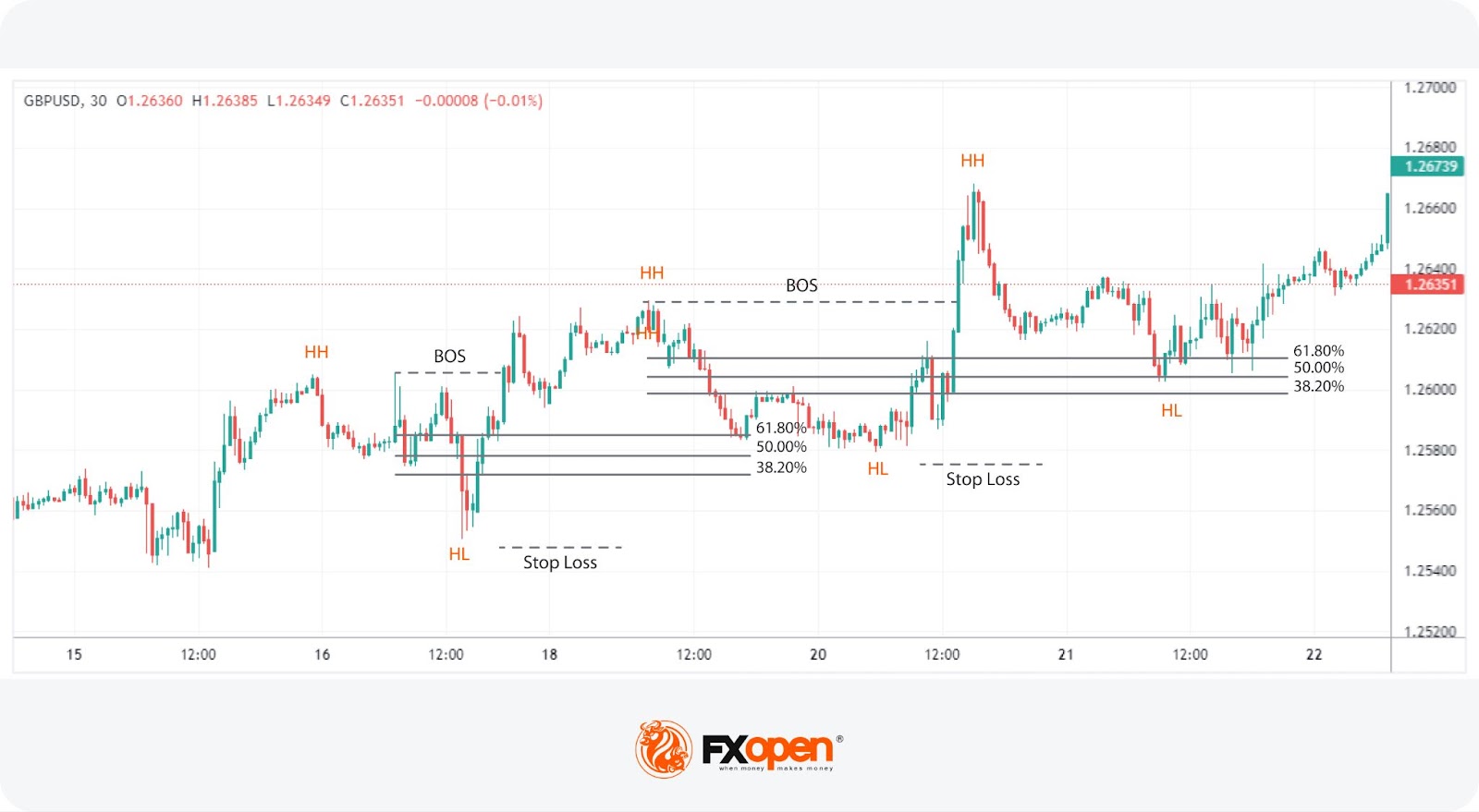 - Traders typically identify a BOS in line with the current trend, employing a Fibonacci retracement tool between the high and low (in an uptrend) or low and high (in a downtrend) of the range the BOS originated from.