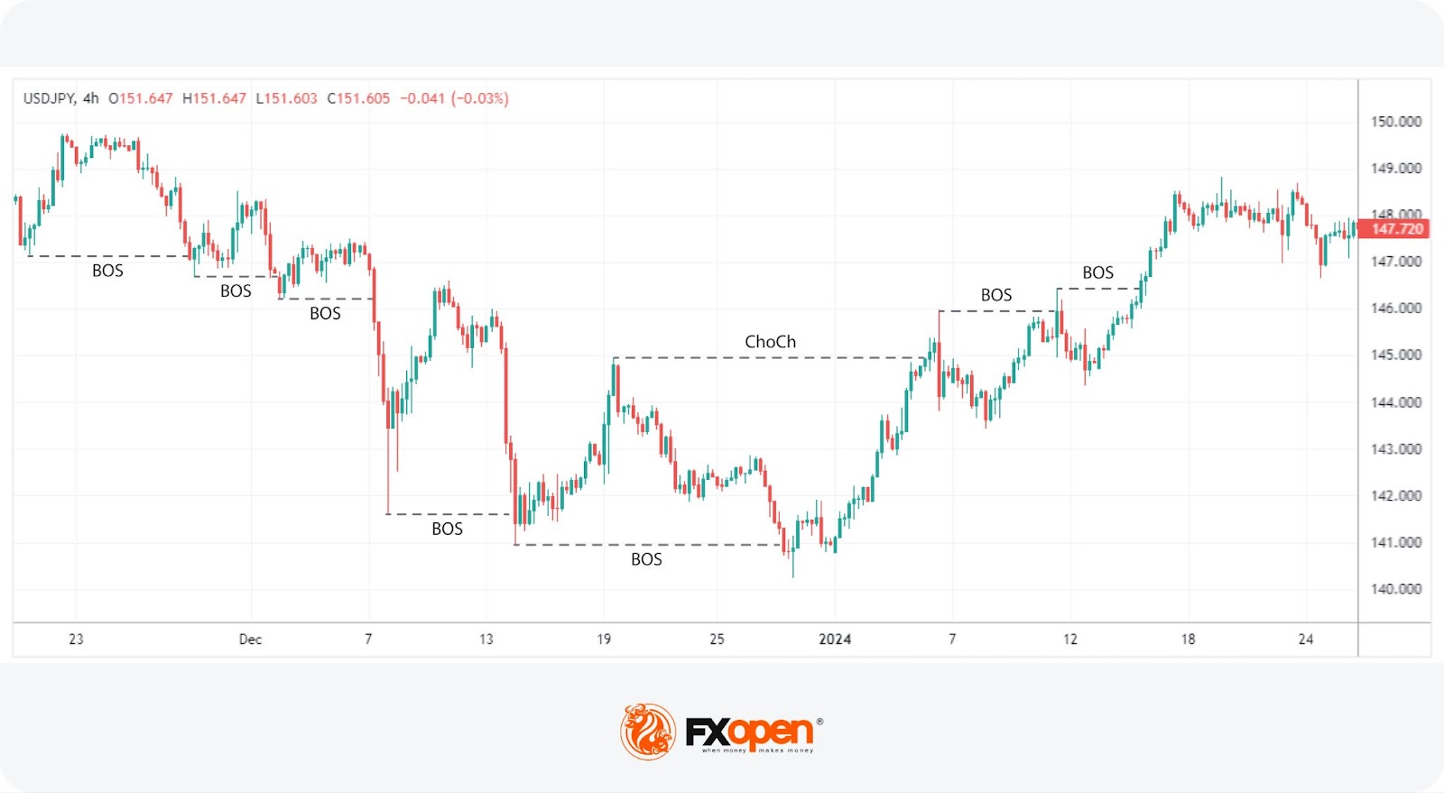 While a BOS aligns with the trend’s direction, a ChoCh represents a break in the opposite direction. It happens when a previously strong swing point, which should act as a barrier to protect the trend, is breached. This breach, especially if it involves a significant swing point, might suggest the onset of a new trend, challenging the current trajectory.