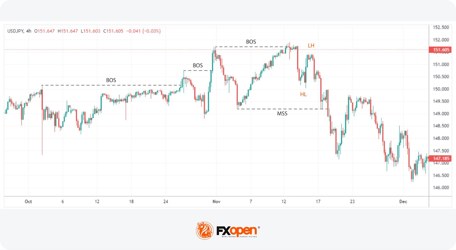 Similarly, in a downtrend, a BOS is identified when a new low is established lower without moving beyond the prior high. This pattern underscores a continuation of the existing direction.