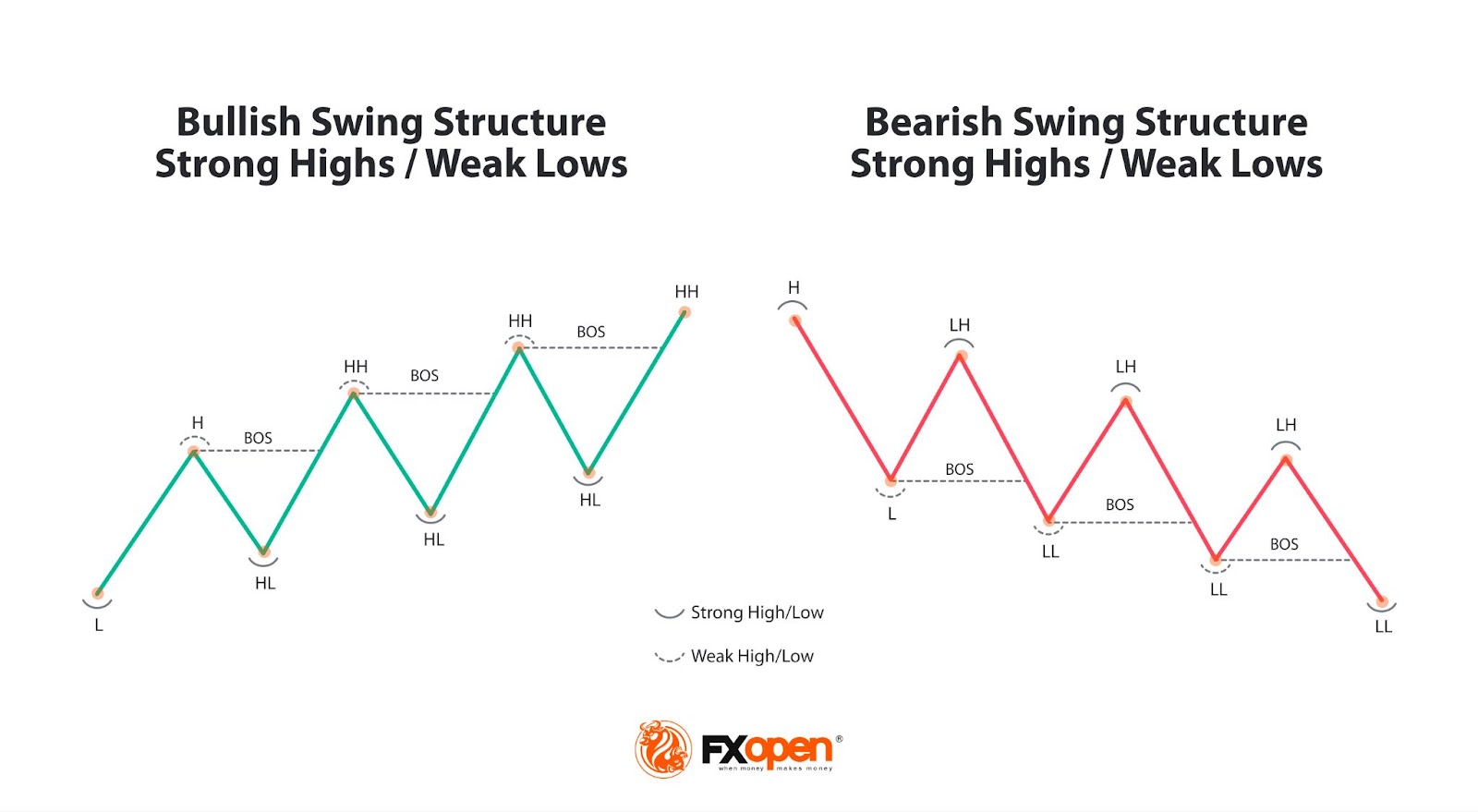 To accurately identify a BOS, traders focus on pinpointing key swing points: the strong swing point, which shouldn’t be breached for the trend to remain valid, and the weak swing point, which is expected to be surpassed if the trend continues.