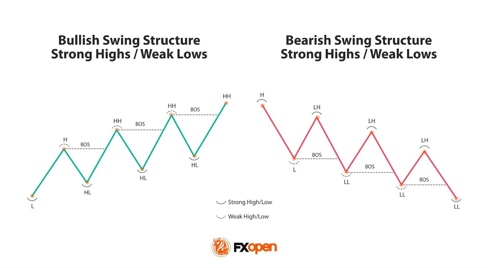 In Smart Money Concept trading, understanding the basics of market structure may be important, particularly when discerning between strong and weak swing points. These points are pivotal in analysing the current trend and play a significant role in identifying potential breaks in structure.