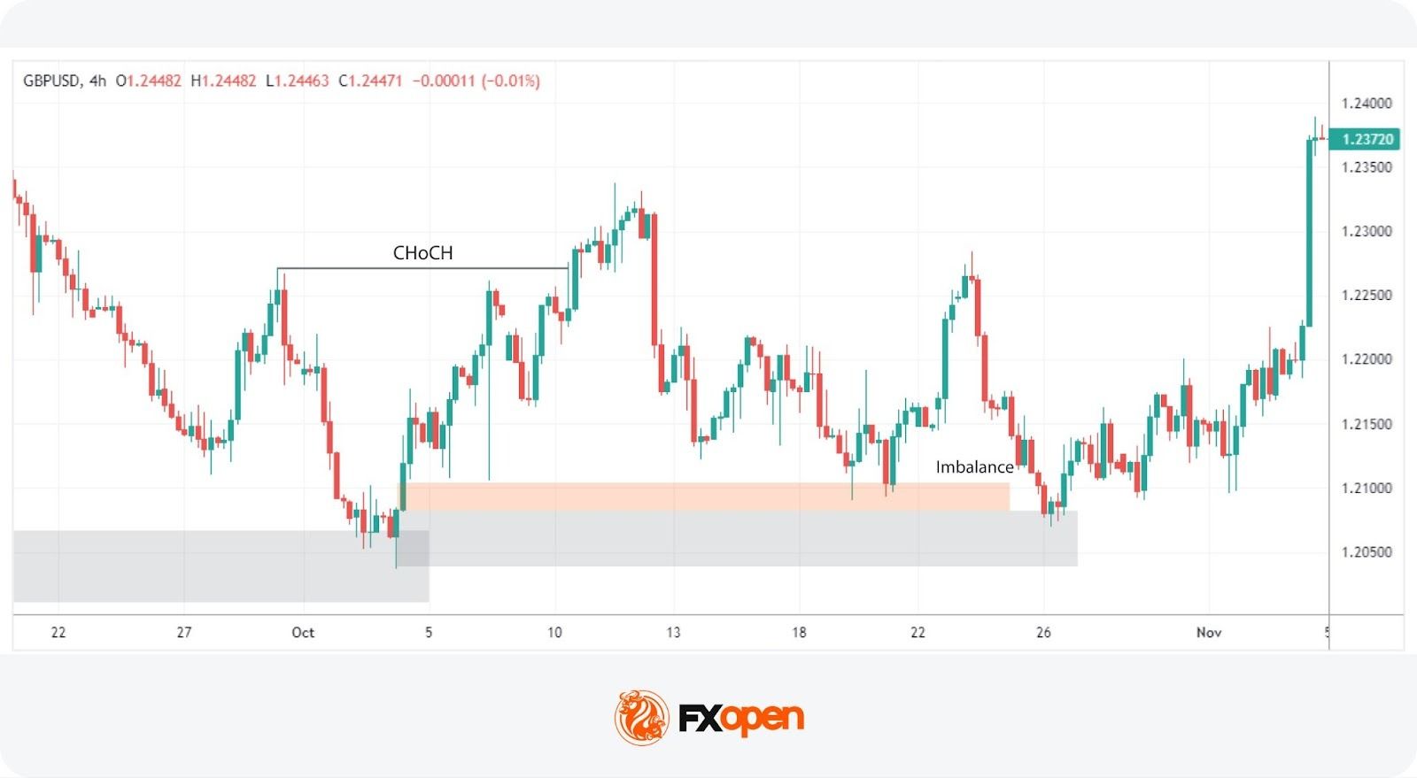 Traders might use this information to close short positions or to consider a long position, capitalising on the emerging upward trend. These short-term CHoCHs allow traders to respond quickly to market changes, potentially securing returns before larger market shifts occur.