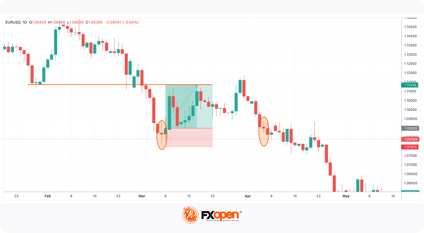 There is another bearish spinning top candlestick pattern on the right. It formed in a solid downtrend; therefore, a trader could use it as a signal of a trend continuation and open a sell position after the next candle closed below the lower shadow of the spinning top candle.