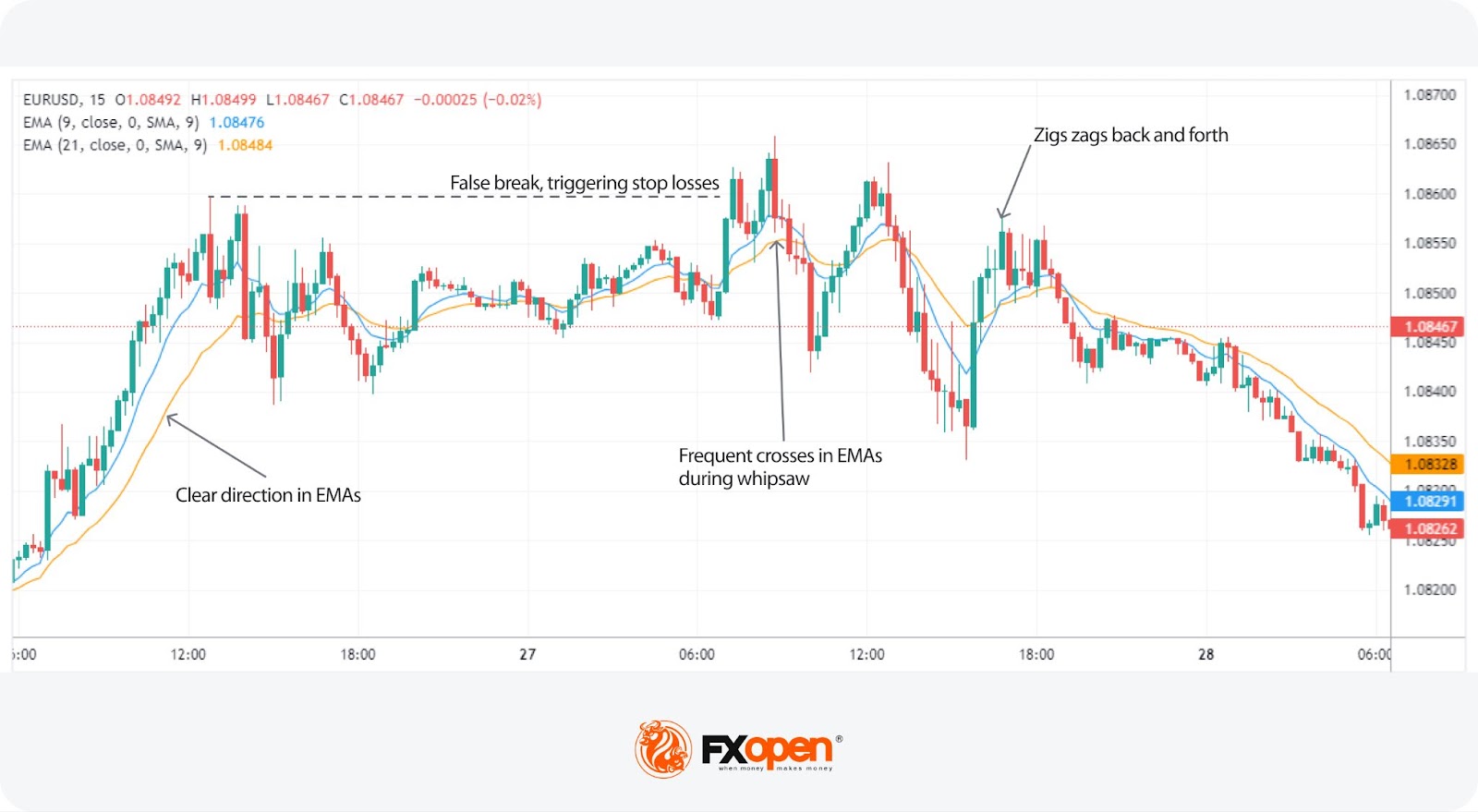 - Moving Averages: When short-term moving averages cross above or below long-term moving averages briefly before reversing, it may signal a whipsaw.