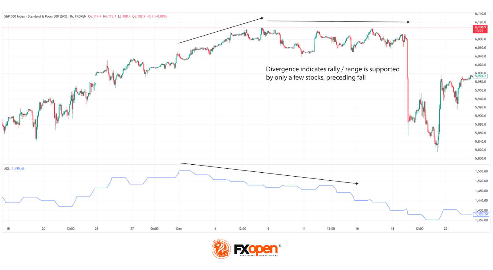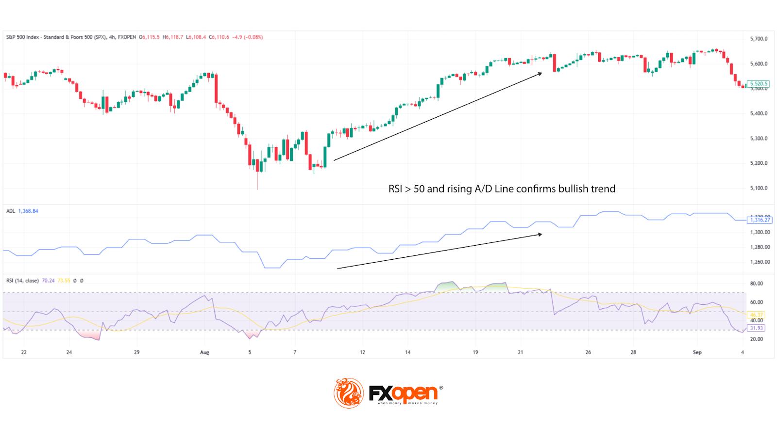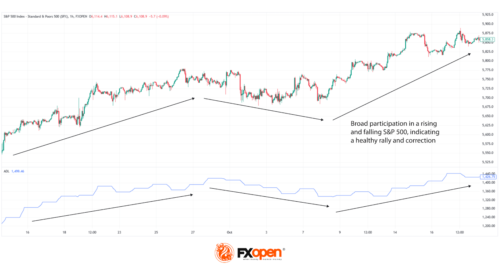 One of the A/D Line’s key uses is evaluating the strength of a market move by examining overall participation. When both the A/D Line and an index rise together, it suggests widespread buying activity, with most stocks contributing to the rally. Similarly, if both the index and the A/D Line decline, it often reflects broad-based selling, indicating that weakness is widespread across the market rather than concentrated in a few assets.