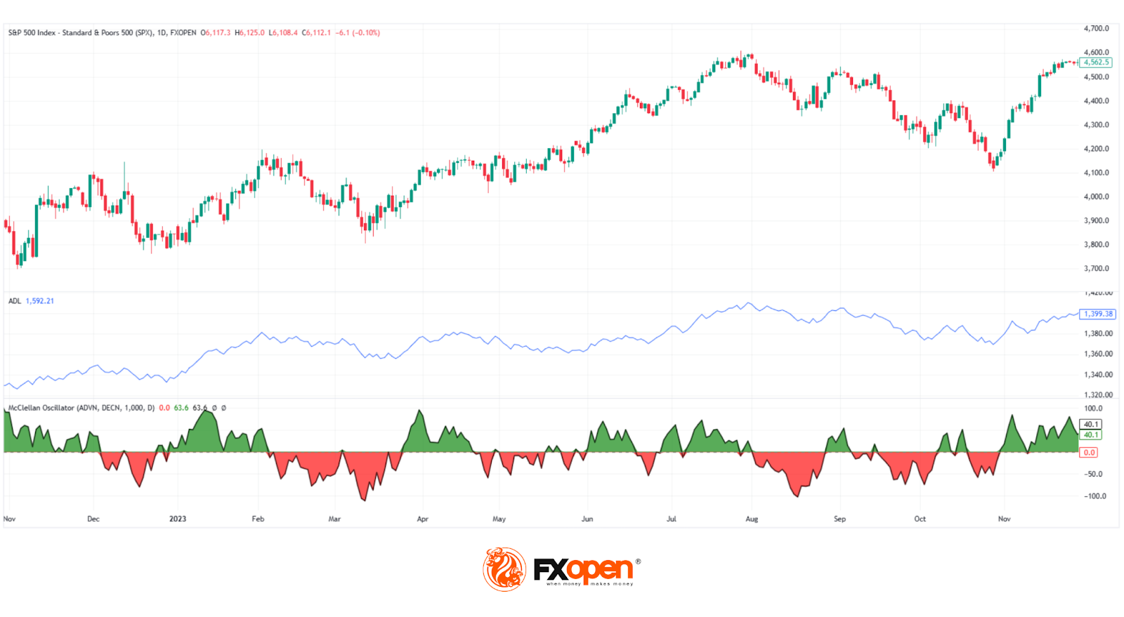 The Advance-Decline line is a valuable tool for traders seeking deeper insights into market trends. By analysing market breadth, it helps identify potential opportunities and risks beyond price movements alone. To explore this indicator further across a range of index CFDs, consider opening an FXOpen account and enjoy competitive trading conditions.