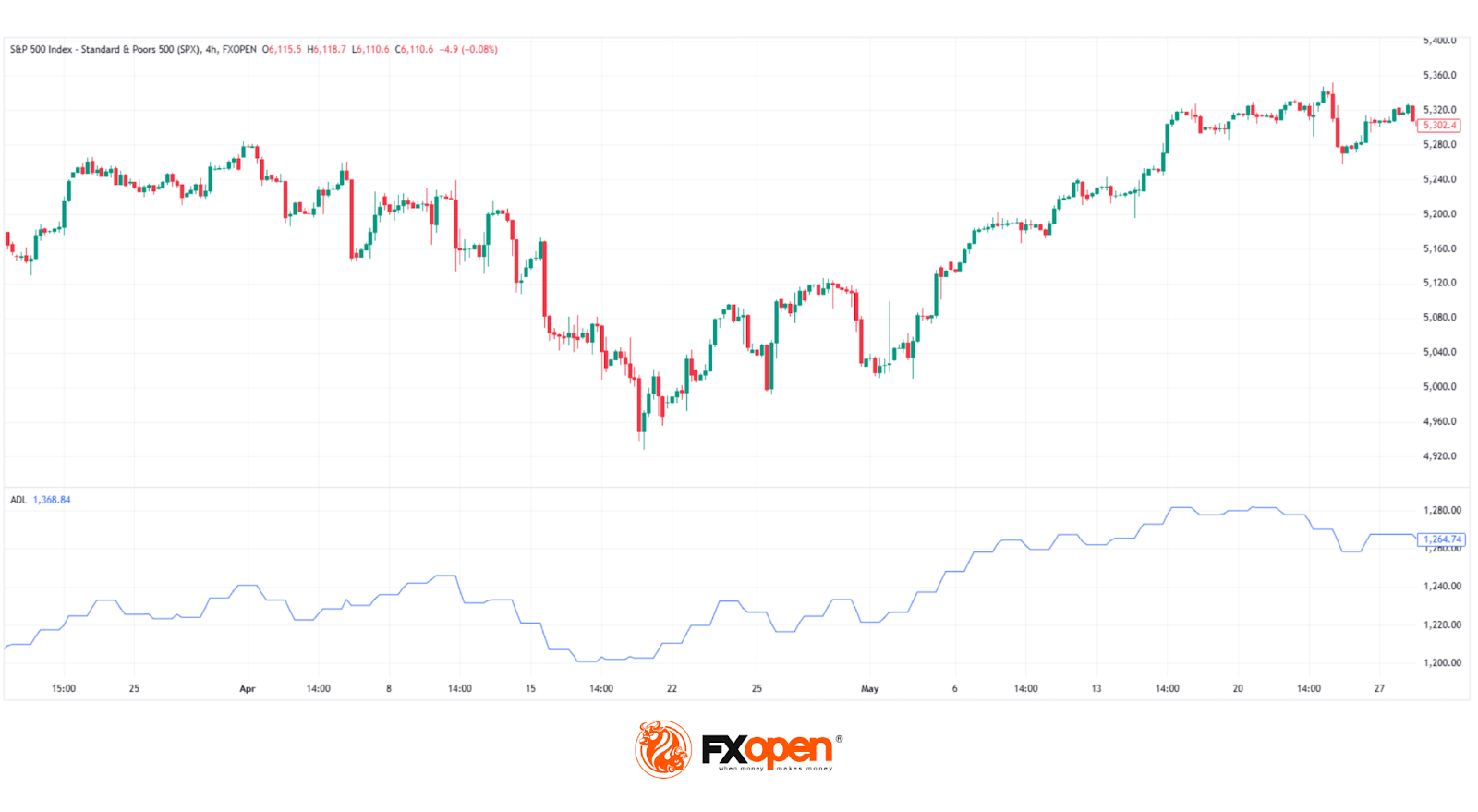 The A/D Line is more than just a market breadth indicator—it’s a practical tool traders use to gain insight into the strength and sustainability of trends. By analysing how the indicator behaves in relation to price movements, traders can uncover potential hidden opportunities and spot potential risks. Let’s consider how the Advance-Decline line behaves on a price chart.