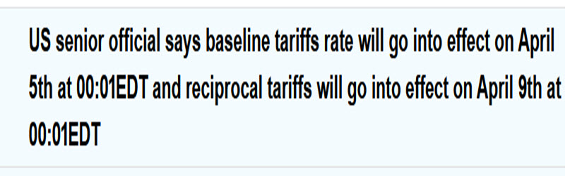 Earlier indications were that the reciprocal tariffs were to go into effect immediately. Now it appears they will not be kicking until April 9.