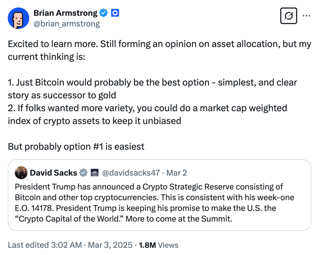 Support for Bitcoin Dominance: Brian Armstrong, CEO of Coinbase, expressed strong support for making Bitcoin the primary asset in any government-led crypto reserve. Armstrong argued that Bitcoin’s proven security and market recognition make it an ideal pillar. He also posited an alternative: a market cap–weighted index composed of top cryptocurrencies, thus distributing risk while reflecting the broader crypto landscape.