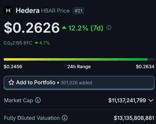 As of August 13 2025, HBAR trades around $0.26 – $0.27. To hit $1.00, the token would need to rise by more than 330%, a leap that wouldn’t be uncommon for altcoins.