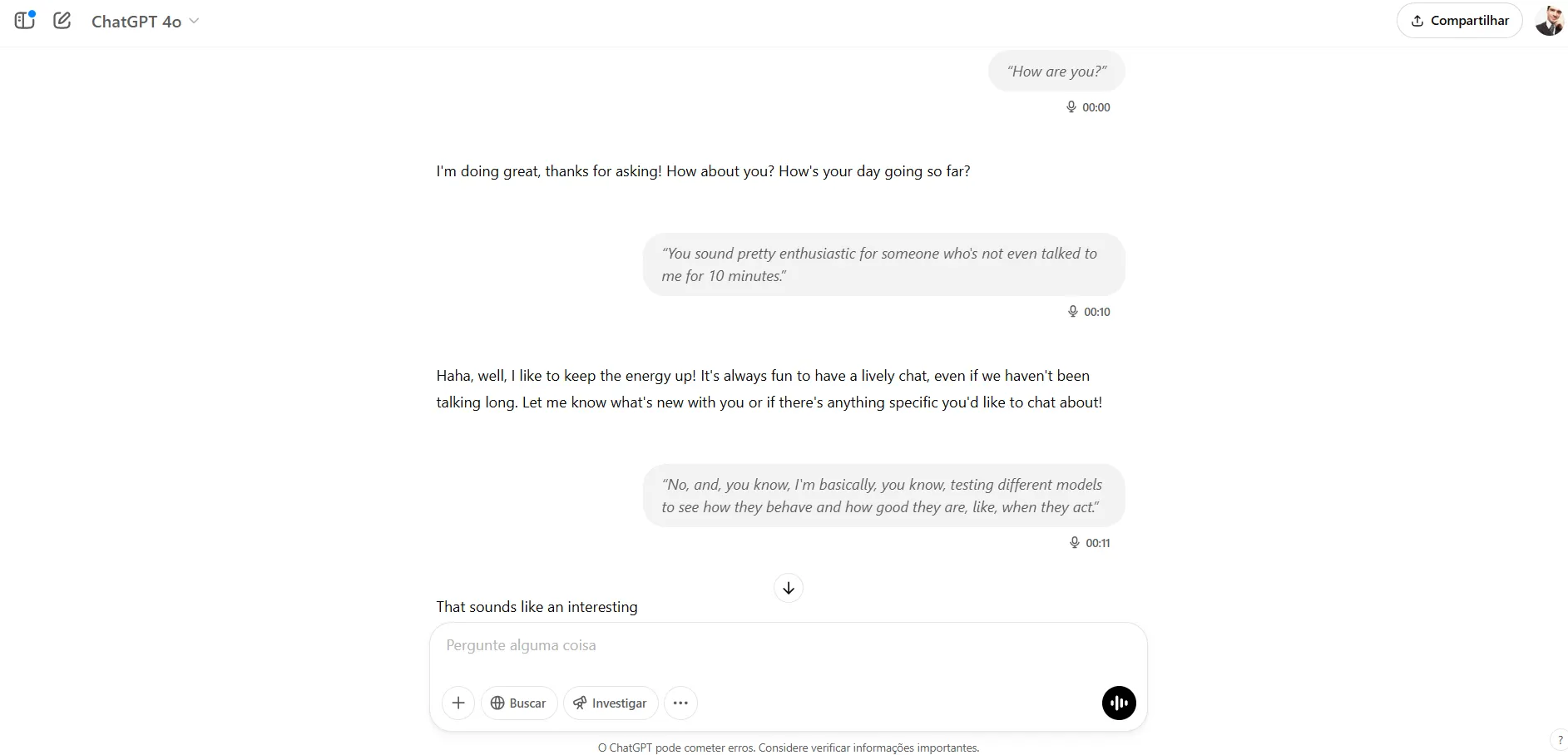 To be fair in our comparison, we tested our models without any previous setup—meaning our conversation started with a hello and went straight to the point. Here is how our models behaved naturally