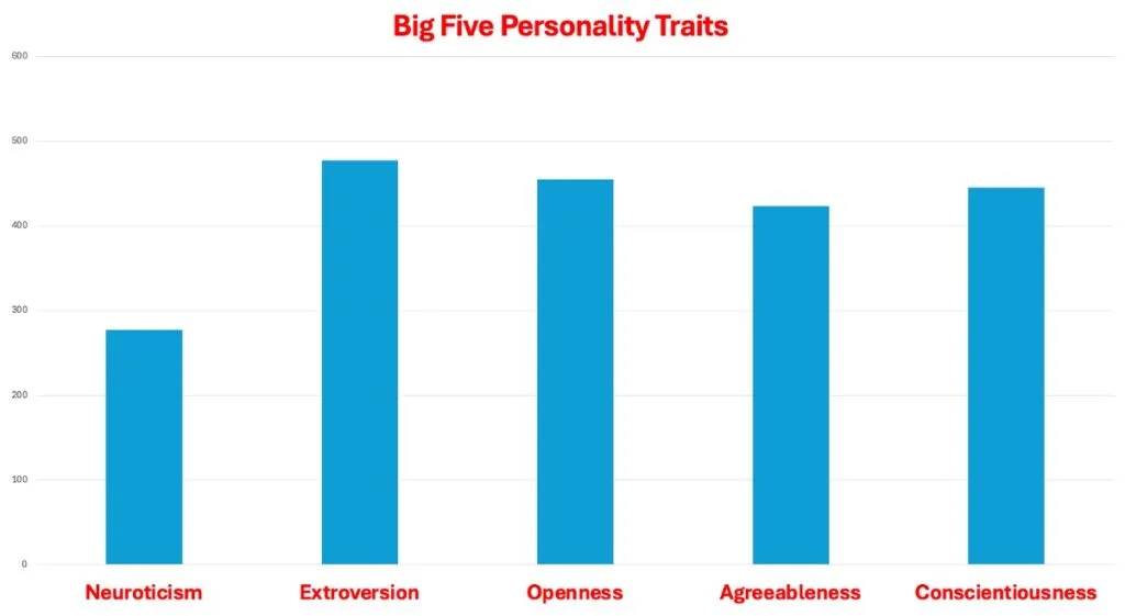 Trying to go beyond impressions and anecdotes, I asked them to take the Big Five Personality Traits test to see how they scored on the different qualities the test claims to measure: Extraversion, Conscientiousness, Openness to New Experiences, Neuroticism, and Agreeableness.