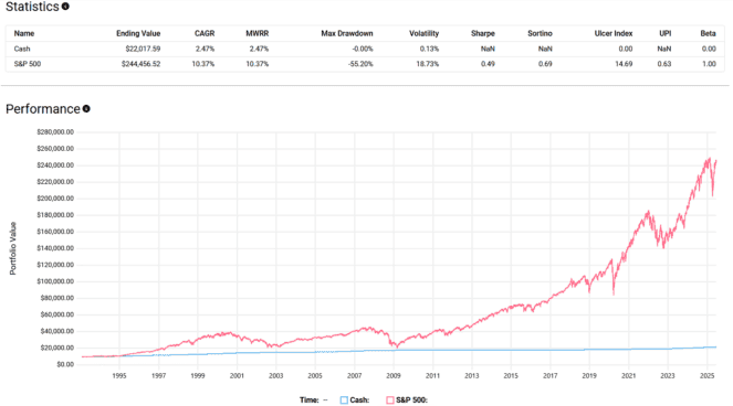 Had you invested $10,000 into the S&P 500 in the early 1990s and left it alone, you’d be sitting on over $240,000 by 2025. That’s a 10.4% annualized return, according to the backtest.