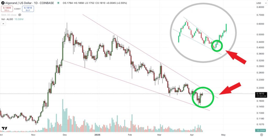 Algorand may be on the verge of a major breakout as altcoins and Bitcoin reach potential bottoms in falling wedges, signaling new continuations.