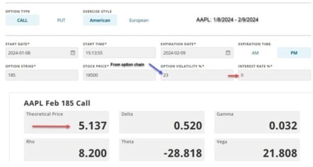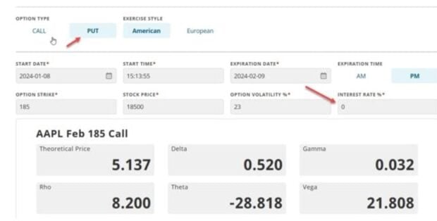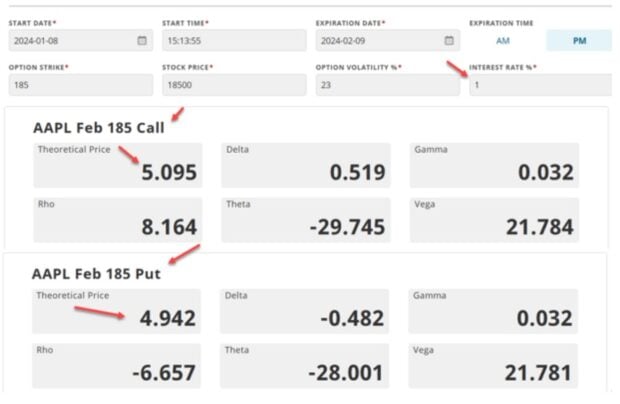 The theoretical option price for the $185.00 call is $5.137 per share (exact price as the call option). We inserted the ATM implied volatility stat of 23% (as with the call).