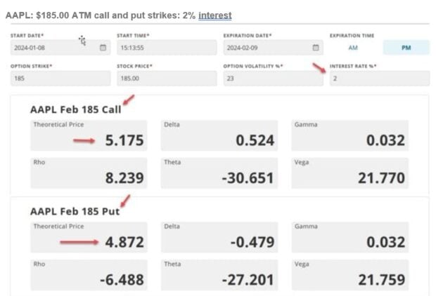 In the screenshot above, we see call value at $5.175 per-share, compared to put value at $4.872 per-share. The difference between call and put value increased as the interest rate increased, accounting for the disparity between ATM call and put strike premiums.