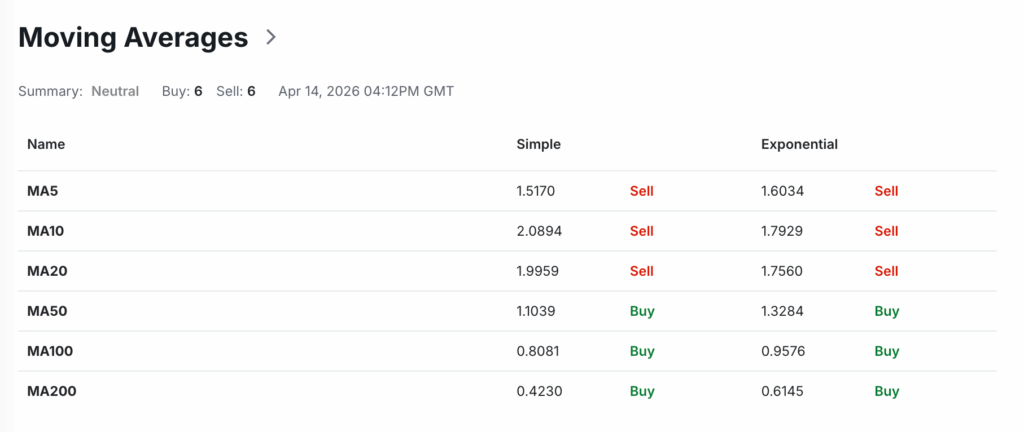 The 50-day EMA sits around $1.32, while the 200-day EMA remains near $0.61, which means the current price still trades above long-term support but struggles below key short-term averages. Simple moving averages also show weakness, as MA5, MA10, and MA20 all signal sell. This setup suggests that sellers dominate the market in the near term, even though the long-term trend has not fully collapsed.