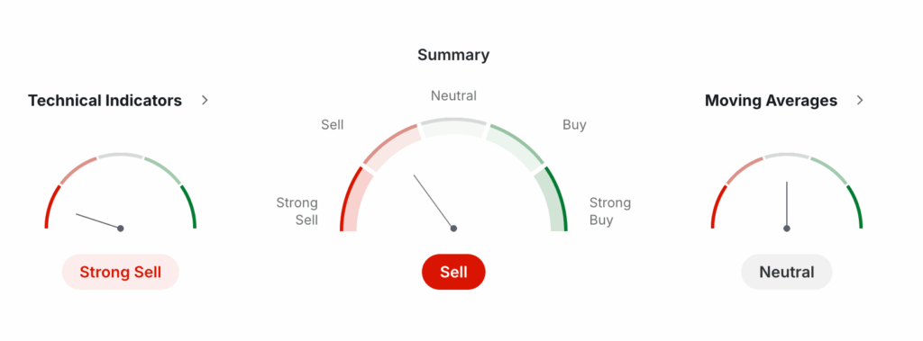 Technical data from Investing.com confirms a strong bearish outlook, with most indicators signaling continued downside pressure. The overall summary shows “Sell”, while 6 out of 8 technical indicators point to selling conditions. One indicator is showing a buy signal, and another is neutral, highlighting weak bullish momentum.