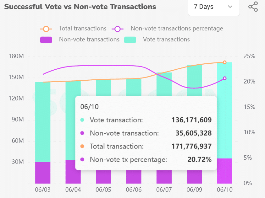 In the past seven days, 80% of total Solana transactions were related to votes, underscoring their dominance on block transactions.
