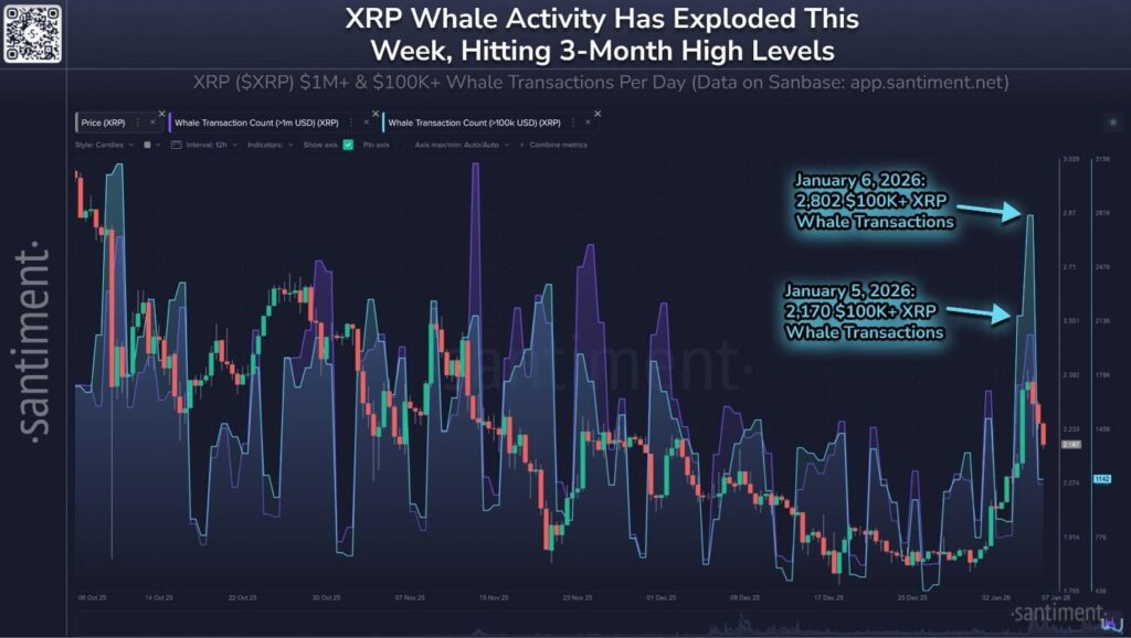 This surge in whale activity is reinforced by data that shows a sharp increase in large XRP Ledger transactions valued at $100,000 or more. The network recorded 2,170 such transfers on Monday, before activity jumped to 2,802 by the following day, marking a three-month high.