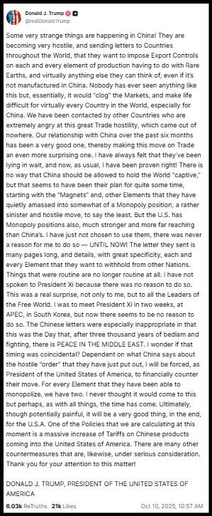 US President Donald Trump sent the market off the cliff on Friday morning by threatening a renewed trade war with the globe’s second-biggest economy. His voluminous social media post below comes in response to China whispering about possible export limits on rare earth metals used in a host of strategic industries.