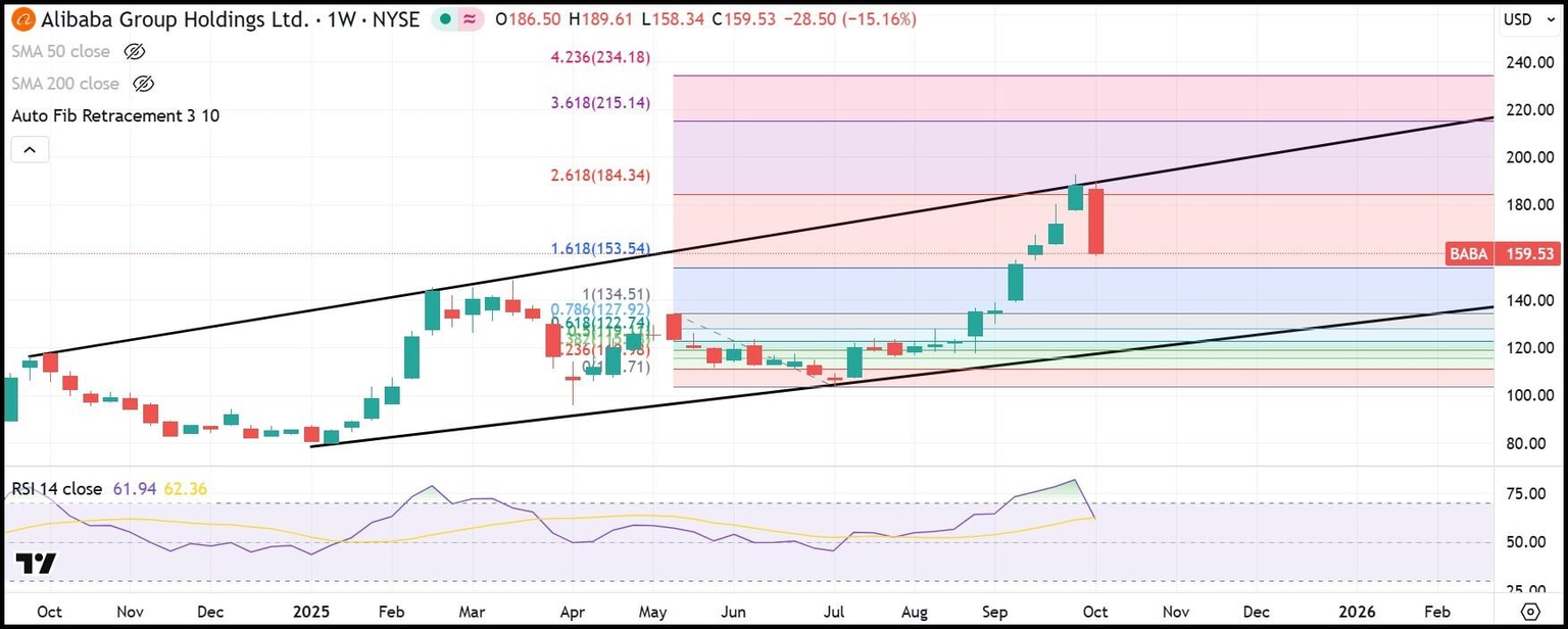 The weekly chart below offers a number of support scenarios in the region stretching from $123 to $134. But of course, the bulls love BABA, and new headlines or a trade deal between Trump and China could quickly end the pullback as soon as next week.