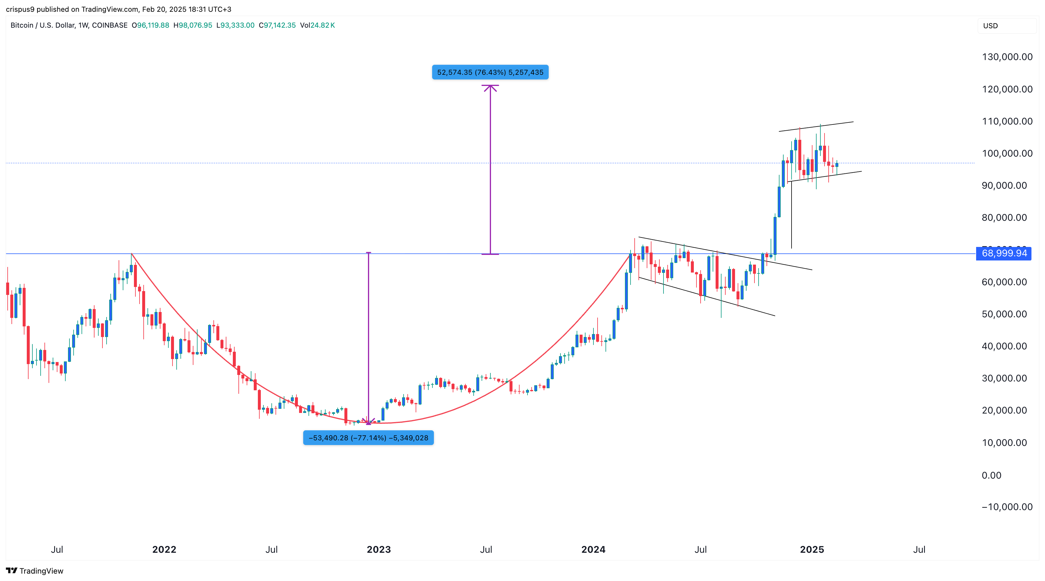 The weekly chart gives a bullish Bitcoin price prediction. It formed a cup and handle pattern that ended in November when it made a strong bullish breakout. The C&H pattern comprises a horizontal resistance and a rounded bottom. It also has a handle, which in this case, formed between March and November last year.