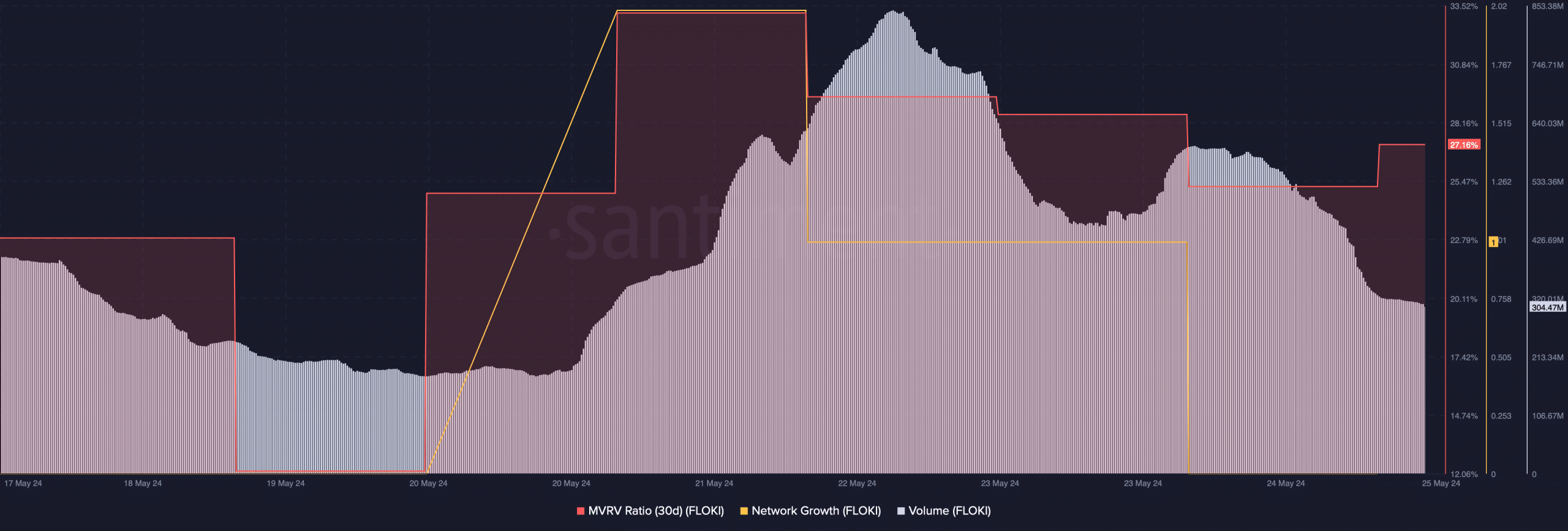 However, the memecoin’s trading volume dropped last week after spiking on 22 May. On top of that, the crypto’s network growth also declined, meaning that fewer new addresses were created to transfer the token.