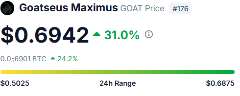 This spotlight boosted investor interest and market visibility. Historically, such visibility has led to increased trading volumes and further price appreciation as more traders jump on the trend. This surge and trending status could potentially set the stage for a sustained uptrend in GOAT’s price, as greater exposure often attracts more speculative buying in the short term.