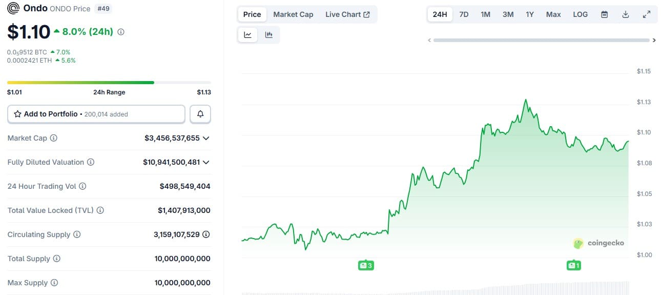 The price of the Ondo Finance token increased by 12% in the last 24 hours, reaching $1.13 on September 12, 2025. The rally follows massive hype around tokenized U.S. stocks and ETFs launched through Ondo Global Markets.
