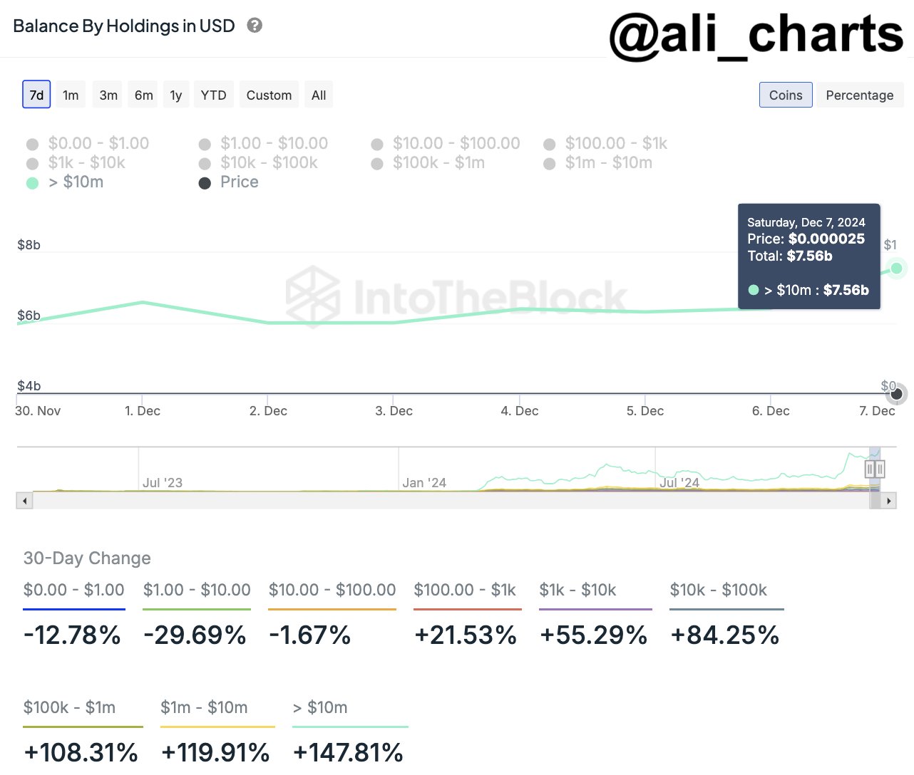 Crypto whales have significantly increased their PEPE token holdings, contributing an additional $1.14 billion in value. The latest data shows wallets holding over $10 million in PEPE surged by 147.81% over the past month. This growth indicates heightened whale interest in the token, potentially influencing its future market trajectory.