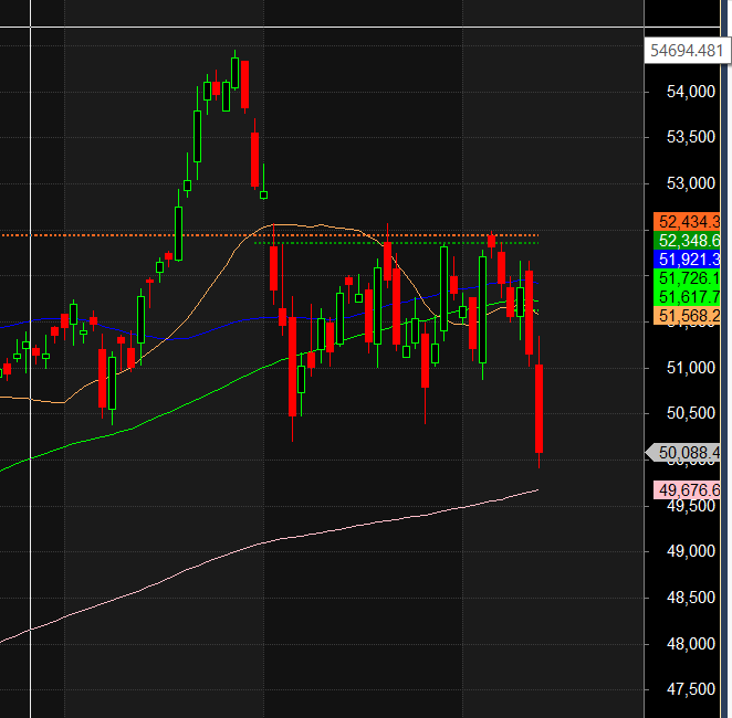 Bank Nifty closed below its 100 SMA @51617 Trend is Sell on Rise till below 50500. 200 SMA @49676