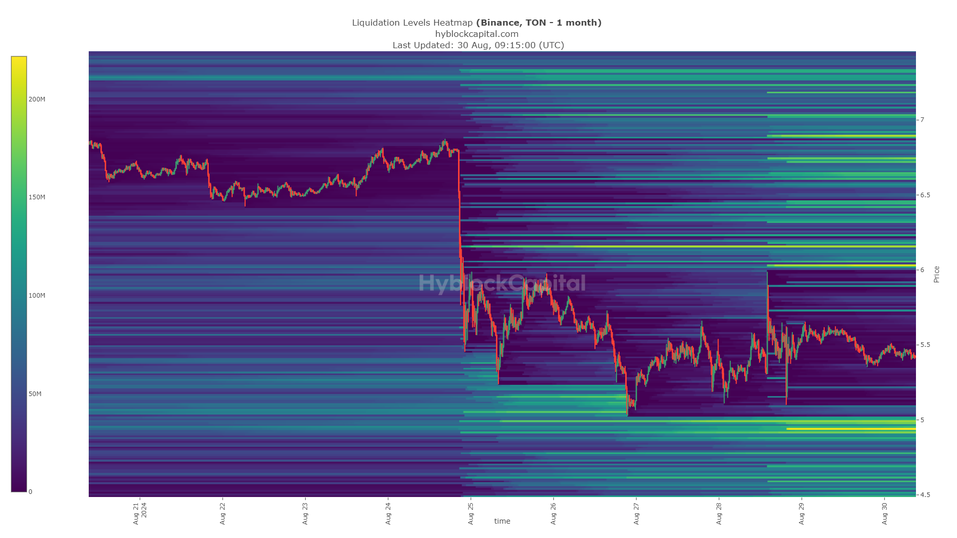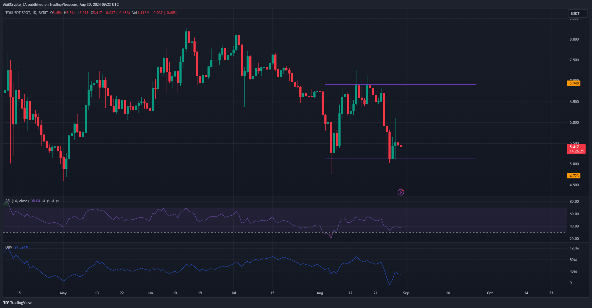 In June and July, Toncoin formed a range whose lows were at the $6.94 level. The selling pressure in late July forced prices to fall as deep as $4.75, changing the $6.94 level into a stern resistance.