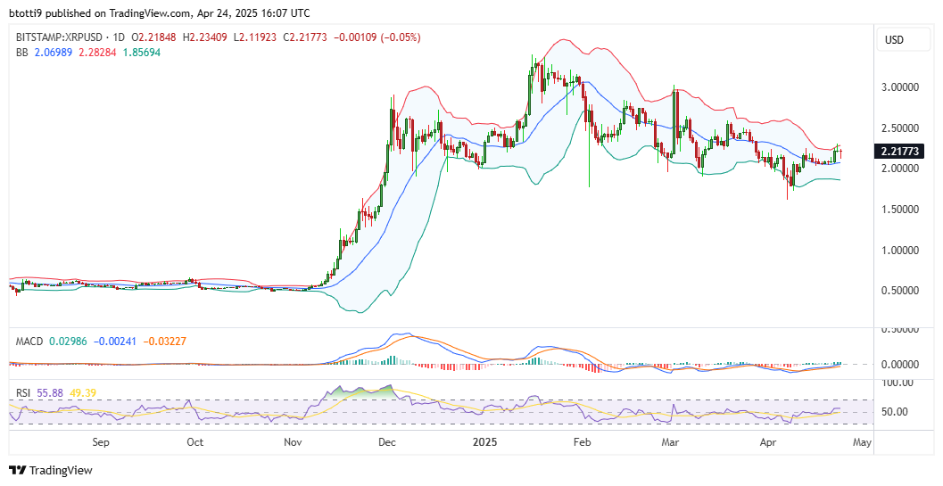 At $2.21, down 1% in the last 24 hours, XRP currently hugs the upper Bollinger Band.
