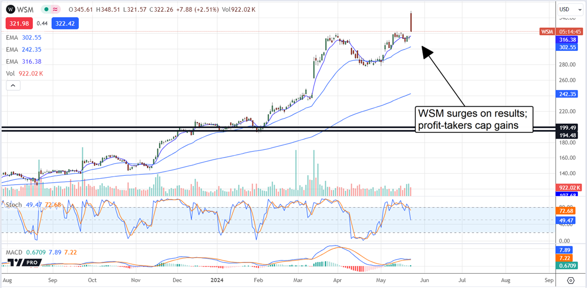 Williams-Sonoma’s stock price surged more than 5% on the news and hit a new high. The bad news is that profit-taking gripped the market, causing it to sell off from the opening high. The move does not negate the power of the breakout, but sellers may cap gains in the near term. The critical support target is the previous all-time high. If that level holds, a rebound should form soon. If not, WSM stock could fall to $300 or lower before resuming the uptrend.