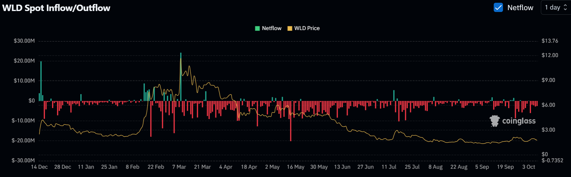 An unusually large inflow in March pushed WLD’s price from $3 to $12, while several months of regular outflows thereafter suggest profit-taking or a loss of confidence from market participants.