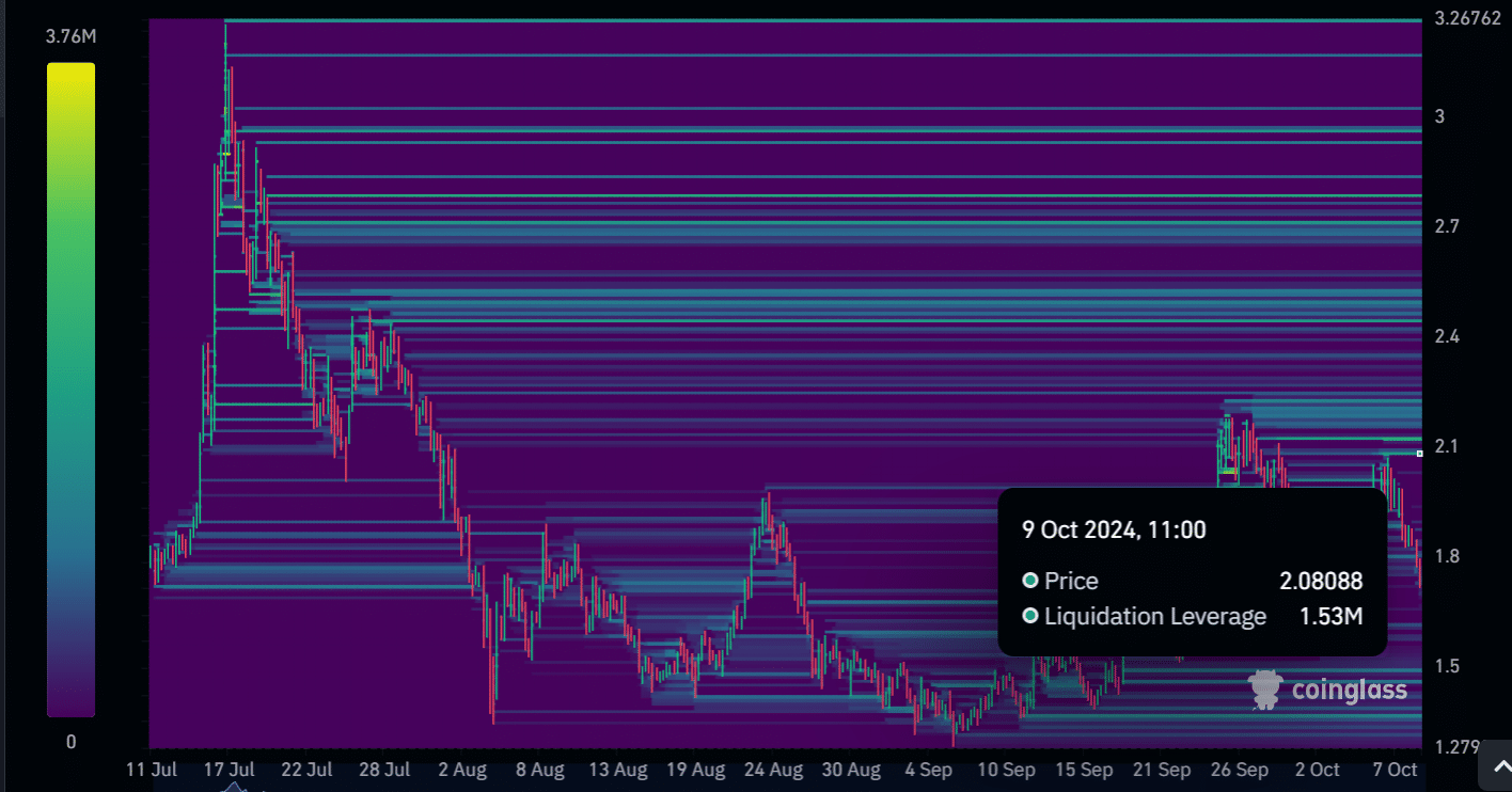 WLD maintains a liquidation pool of about $1.53 million at its key price level of $2.01, according to data from Coinglass. This significant large pool should indicate a strong bullish bias that would keep the market participants very interested.