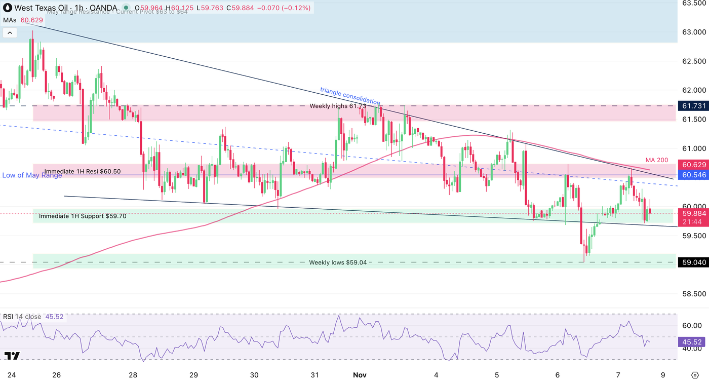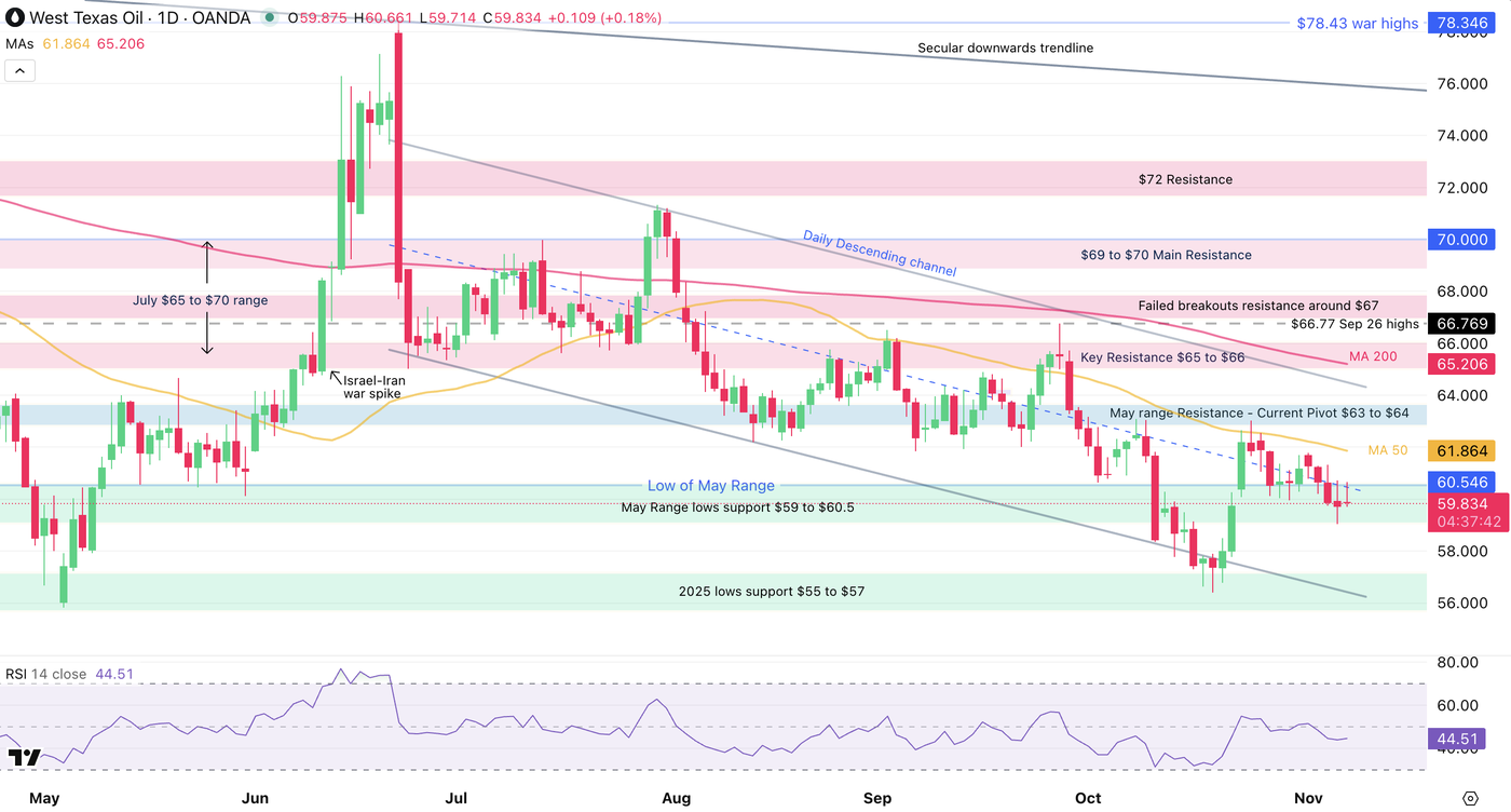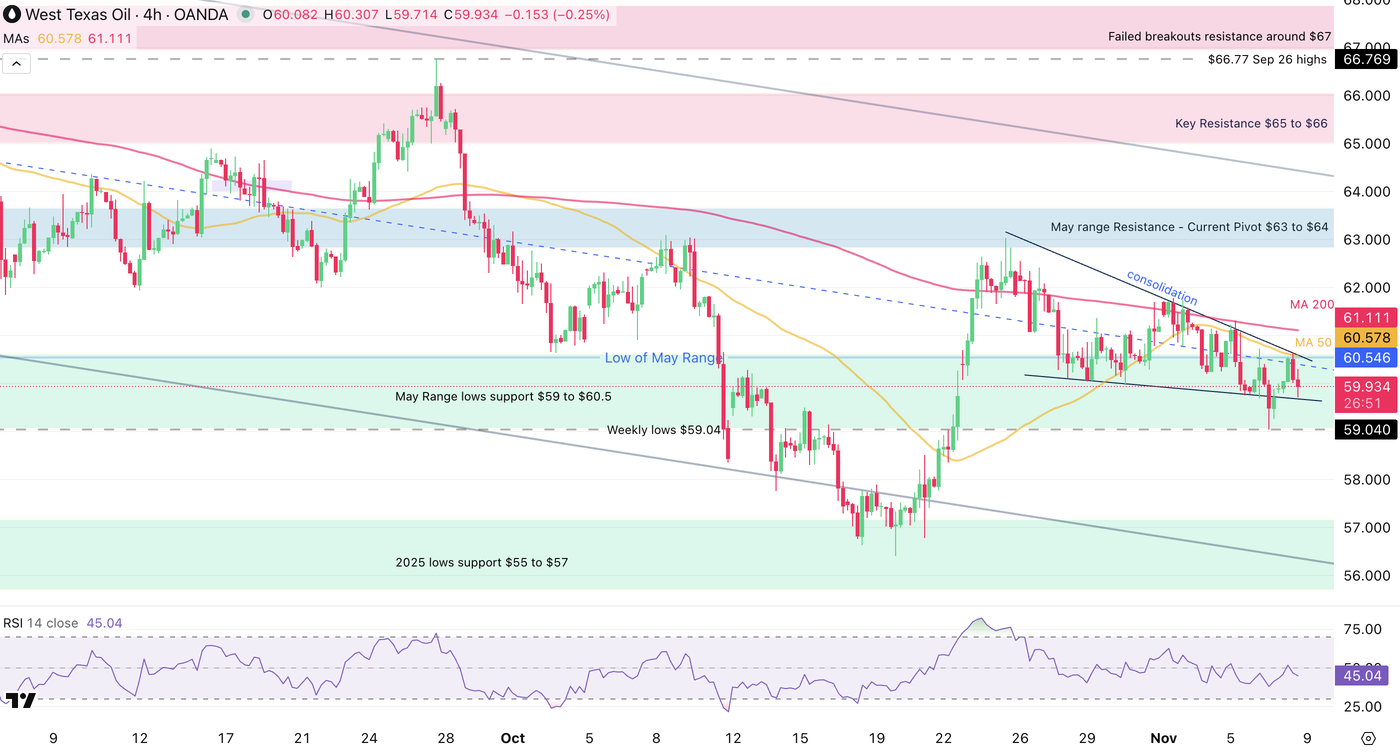 Although prices remain technically higher than the April 2025 post-Liberation dip, price action remains highly undecided right around the $60 key psychological support mark.